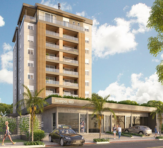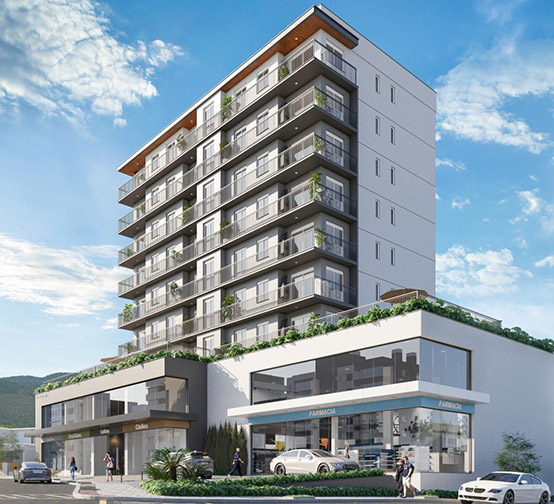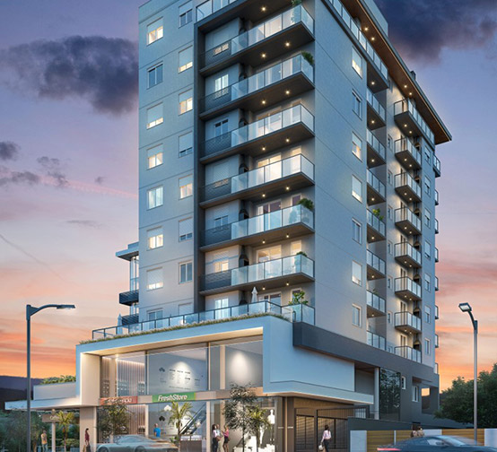 Projeto estrutural e fundações de edifício comercial e residencial de alto padrão com 2.400 m² e 6 pavimentos. Construção: Construarte Engenharia e Construções